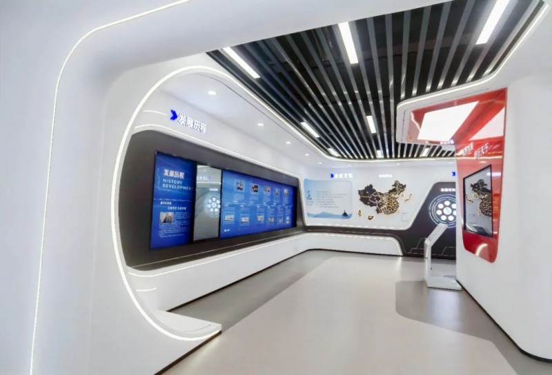 展廳中多處運用電子互動大屏放映企業(yè)專題片,并且將展廳墻體直角部分改為弧形,與曲面屏呼應(yīng)的同時增強了空間的整體流動性。展廳運用統(tǒng)一基礎(chǔ)標準色調(diào),使得整個展廳風格更加統(tǒng)一。在頂部運用線性燈與筒燈進行融合照明,提升視覺美感。